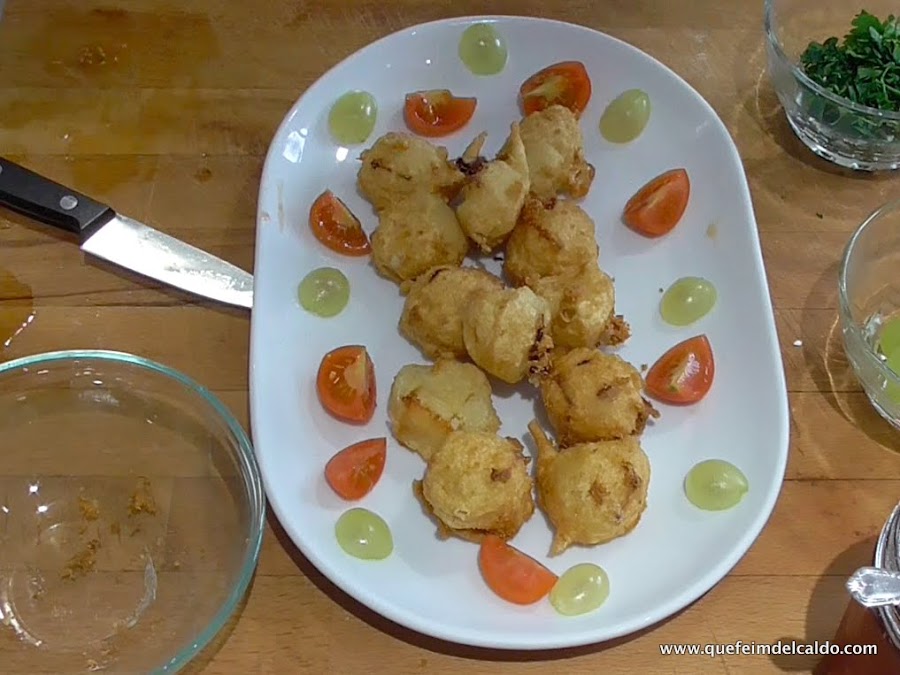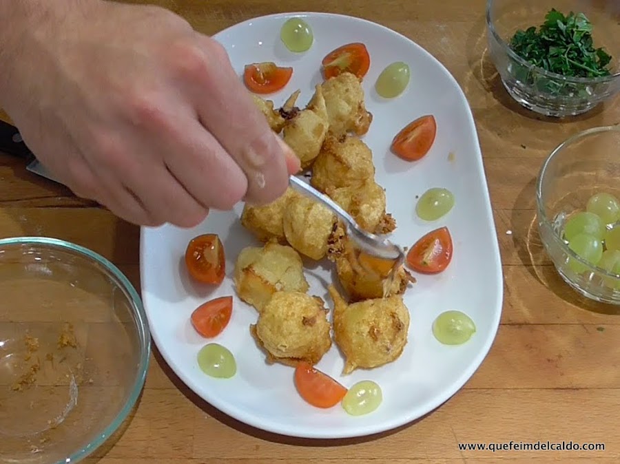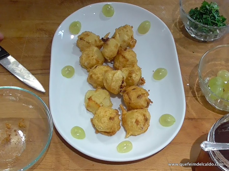 Emplatamos colocando en una fuente los buñuelos, decoramos con los medios granos de uva.