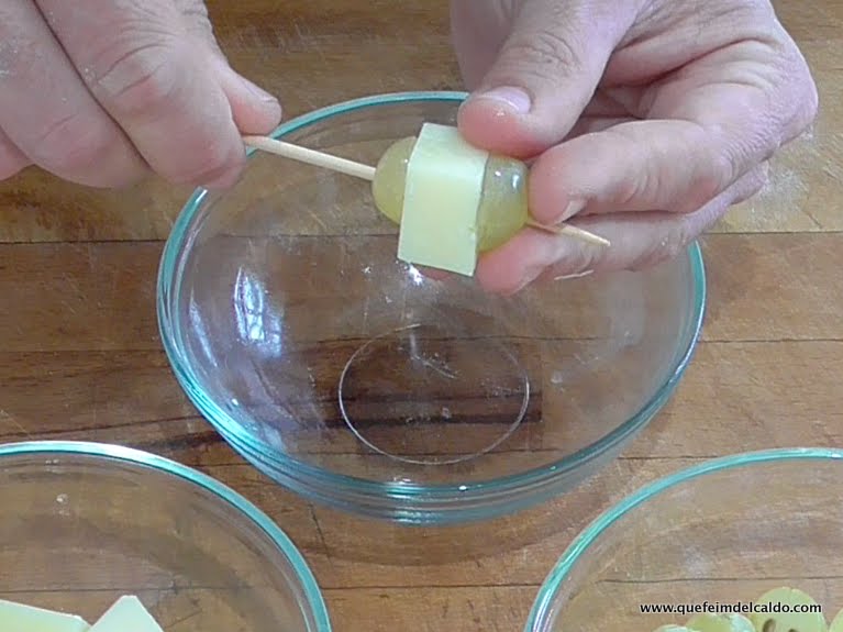 Empezamos a hacer las brochetas, pinchamos medio grano de uva y la atravesamos con un trozo de queso.
