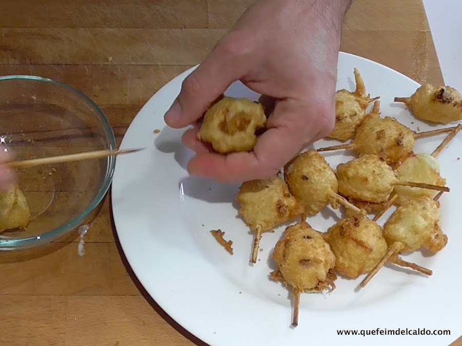 Una vez fritos, limpiamos las puntas de los palillos y extraemos el palillo.
