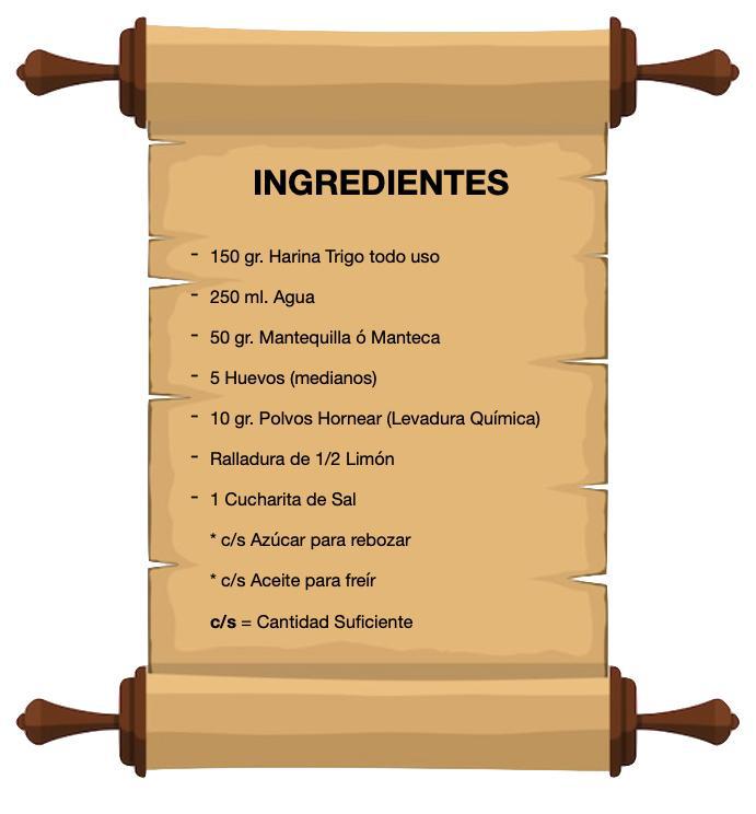 Como hablamos de una Receta tradicional de toda la vida transmitida de nuestras abuelas generacionalmente, me hacía mucha ilusión poner los Ingredientes de mis Buñuelos en un pergamino; como si fuera el trabajo del cole… (l@s que fueron a E.G.B. lo entenderán)INGREDIENTES