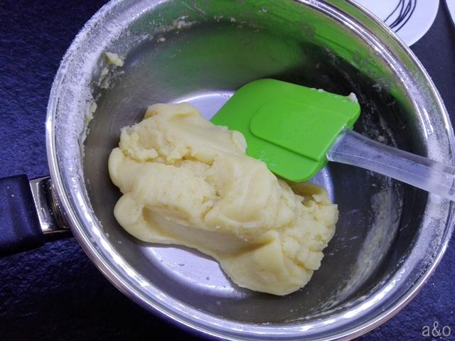 2º. A continuación, volvemos a verter la leche en el cazo y fundimos en ella la mantequilla. Cuando empiece a hervir, retiramos y echamos la harina tamizada y mezclamos. Os tiene que quedar una consistencia como la de la foto. Después, es hora de echar los huevos batidos. Cuando vertáis el segundo, debéis hacerlo poco a poco, según os vaya pidiendo la masa, porque a lo mejor, no es necesario echar del todo el segundo huevo. La consistencia debe ser la de una masa que tiene peso, pero que cae sin problemas. De tal forma que no quede ni muy líquida, ni muy sólida, lo que en cocina se conoce como punto pico de pato.
