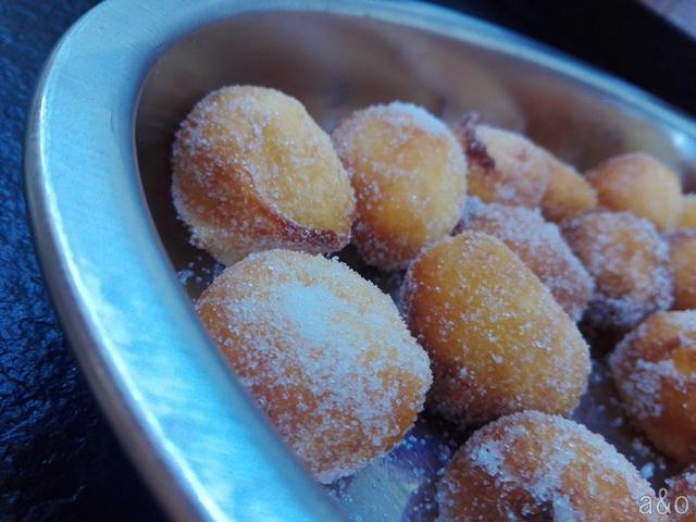 3º. Luego ponemos una olla con abundante aceite al fuego. Una vez esté caliente, ayudándonos con dos cucharillas, vamos haciendo bolitas que irán directas al aceite. Para saber si la olla está suficientemente caliente, podréis observarlos si la masa que vertamos empieza a flotar en el aceite y a burbujear. Si es así, perfecto. Poco a poco y con la ayuda de una espumadera, iremos moviendo los buñuelos para que se vayan friendo por todas sus caras. Una vez hechos y aun calientes, los rebozamos en abundante azúcar.