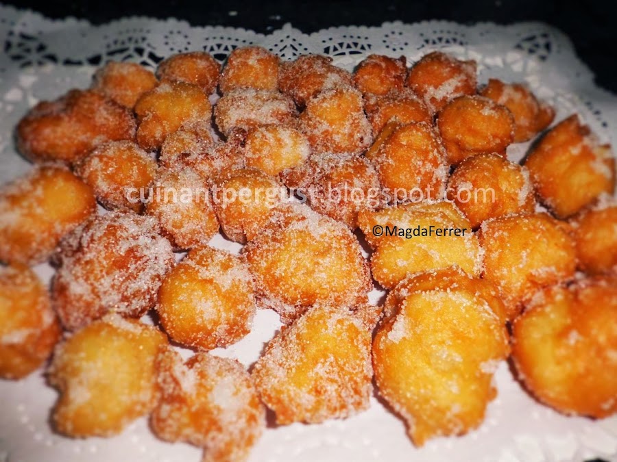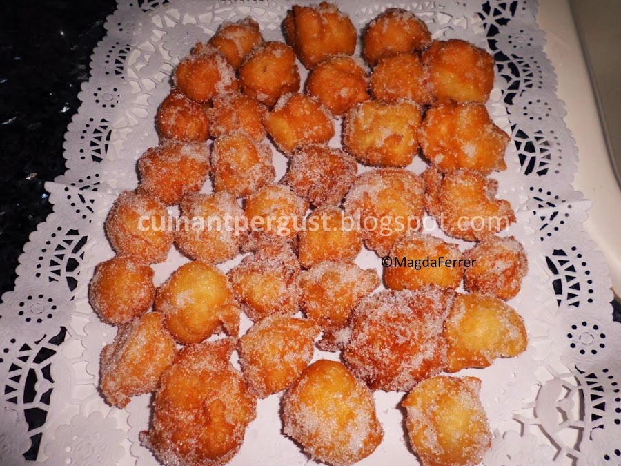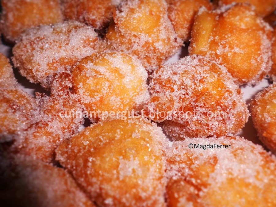 Tomar con una cuchara de postre pequeñas porciones de la pasta, tratando que queden lo más redondas posible, y freírlas en una sartén con abundante aceite de oliva no demasiado caliente ya que se dorarían demasiado deprisa sin hincharse. A medida que los buñuelos se doran, ellos mismos se dan la vuelta para dorarse. No freír más de 3 ó 4 porciones a la vez para que no se estorben entre ellos. A medida que estén dorados, rebozar aún calientes en azúcar y depositar sobre papel cocina para que éste absorba la grasa sobrante. Servir.
