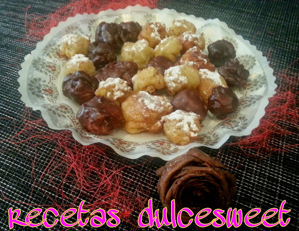7- Preparamos la cobertura de chocolate, `poniendo un poco de nata (crema de leche) a calentar en el micro, una vez caliente pondremos el chocolate fondant y lo moveremos hasta que este totalmente derretido, pasaremos por el chocolate la cantidad de buñuelos que queramos bañar, los otro se espolvorean con un poco de azúcar glas.