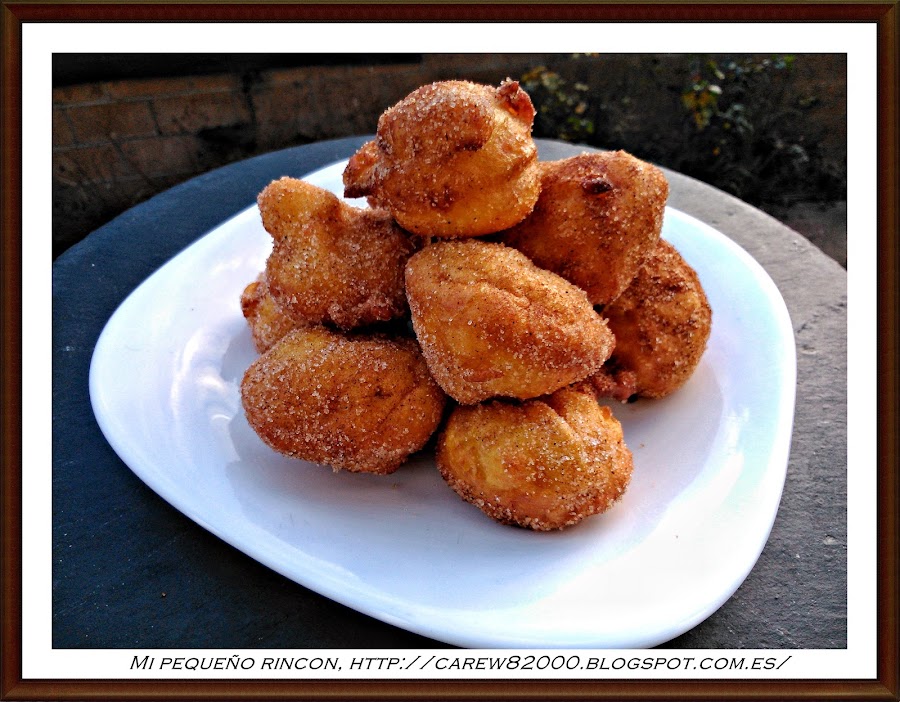 Ponemos abundante aceite en una sartén y ponemos al fuego, cuando esté caliente vamos echando cucharaditas de masa a la sartén y dejamos que frían cuando suban a la superficie les damos la vuelta para que nos queden unos buñuelos redonditos, dejamos dorar y sacamos a papel absorbente para quitar el exceso de grasa, rebozamos con el azúcar y la canela y repetimos este paso hasta terminar de freír toda la masa.