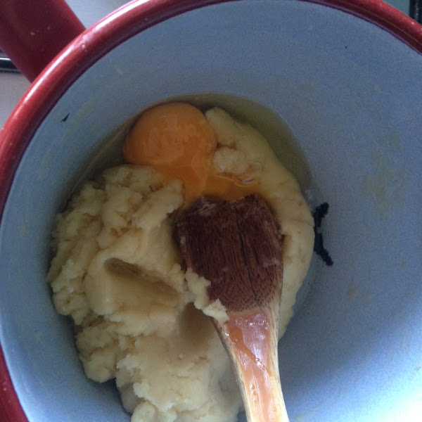 Una vez la masa está atemperada en un bol batimos un huevo y se lo añadimos mezclando muy bien hasta que se integre completamente en la masa.