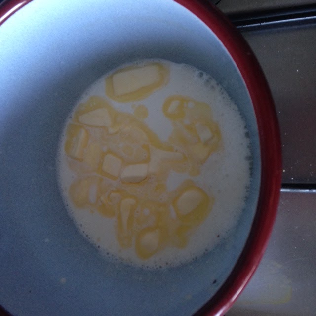 Volvemos a poner la leche en el fuego, le añadimos la mantequilla y cuando se funda la pizca de sal y la cucharadita de azúcar y retiramos cuando rompa el hervor.
