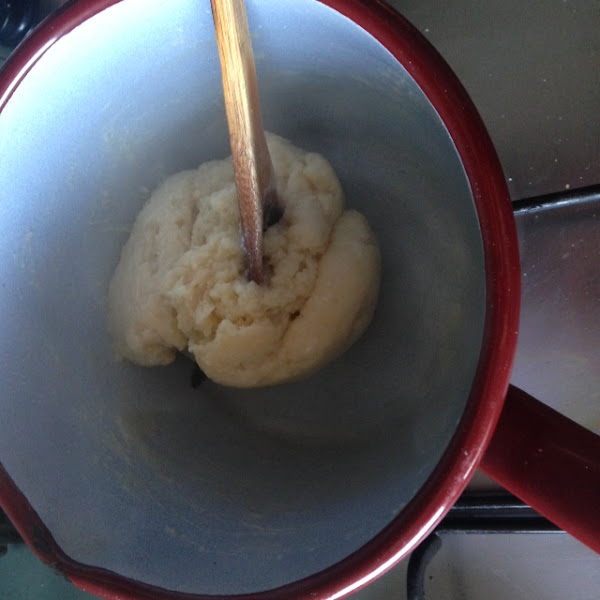 Con el fuego apagado añadimos la harina de golpe y mezclamos bien hasta tener una masa homogénea y consistente.