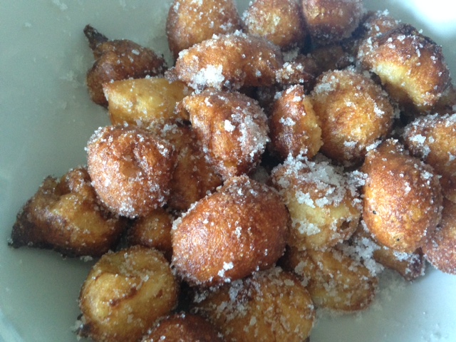 Ponemos la masa en una manga pastelera vamos sacando pegotitos con los dedos y friendo en abundante aceite de girasol hasta que estén dorados. Rebozamos en azúcar y están listos.
