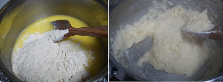 Iremos removiendo lo del cazo, cuando esté mezclado añadiremos de golpe la harina, removemos hasta que se despegue la masa de las paredes del cazo. Retiramos del fuego añadimos las cucharadas de anís, lo removemos y dejamos reposar 5 minutos.
