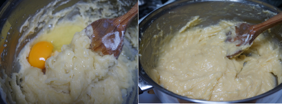 Empezaremos añadiendo un huevo, removemos hasta integrarlo bien en la masa, añadimos el siguiente y volvemos a mezclar bien. Para que la masa quede más consistente es mejor dejar la masa reposar 1-2 horas.