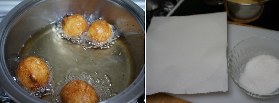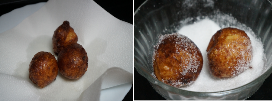 Dejaremos se doren los buñuelos por todos los lados. Los iremos sacando y dejándolos en papel absorbente. Antes de que se enfríen los pasaremos por azúcar.