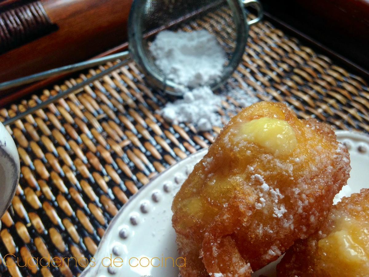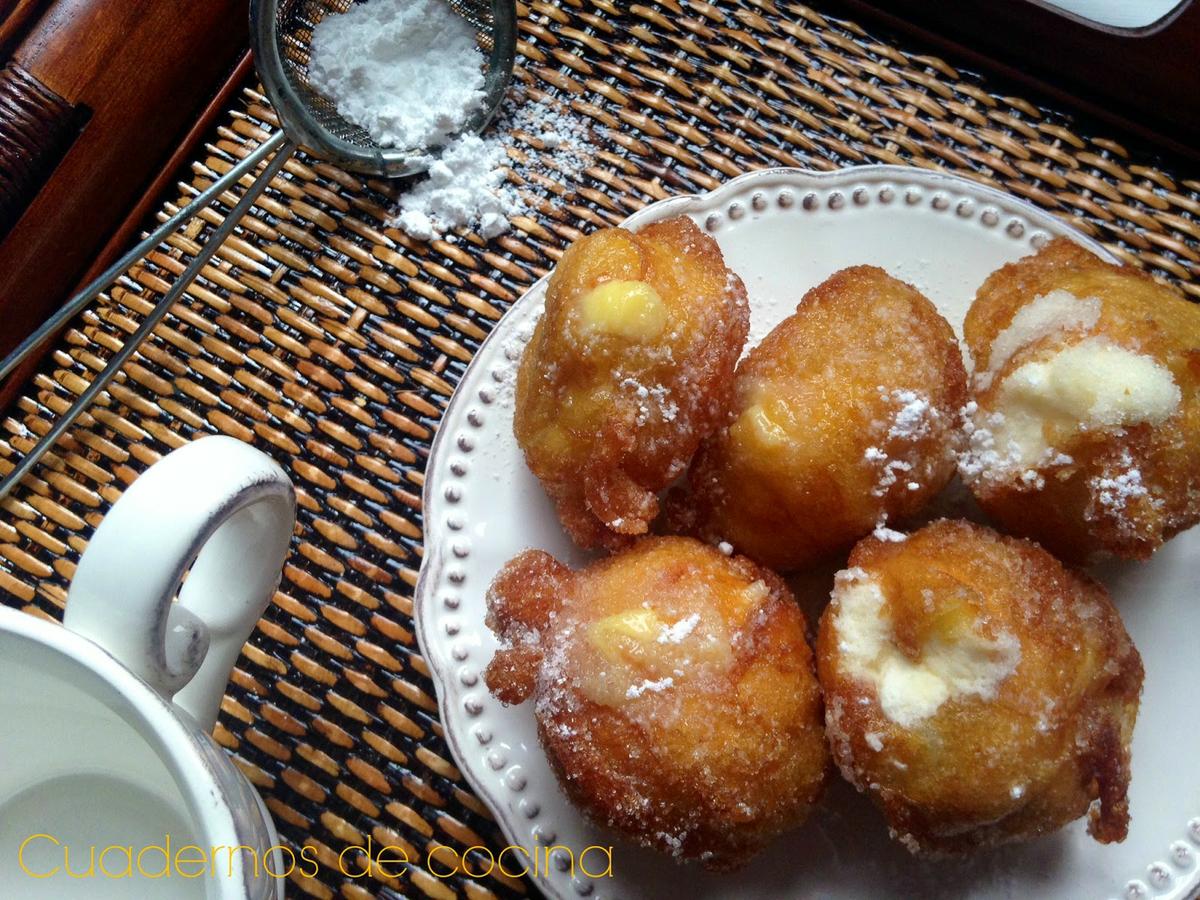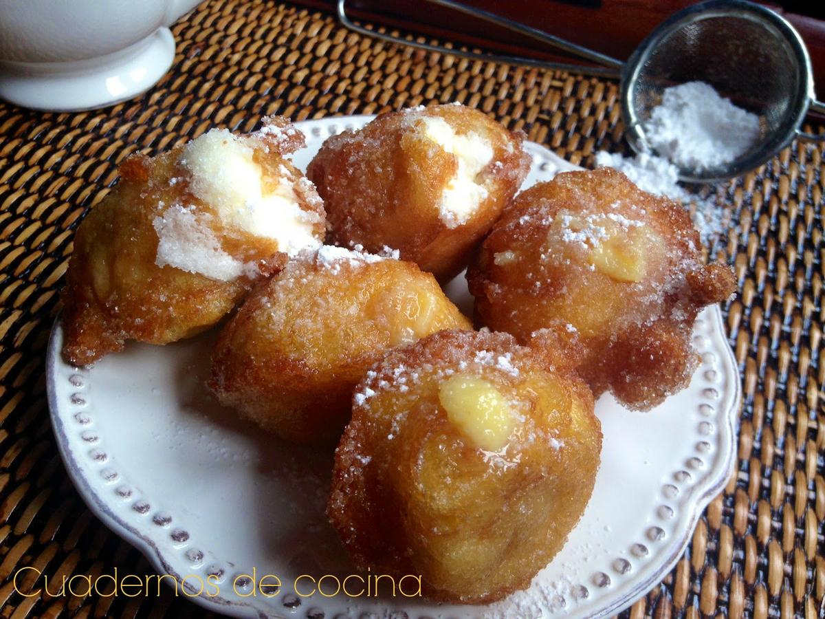 Montar la nata (crema de leche) con azúcar al gusto y rellenar los buñuelos.Para rellenar de crema pastelera, dejar enfriar la crema por completo antes de rellenarlos. Yo los rellené con ayuda de una manga pastelera y una boquilla.