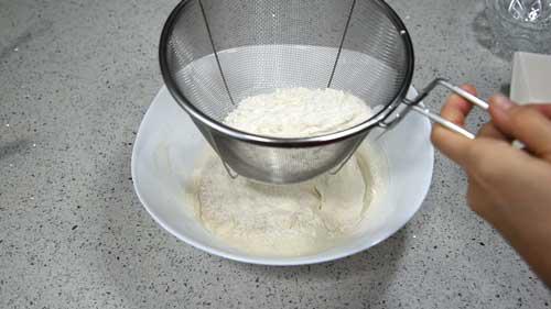 A continuación, añadimos la harina de trigo de todo uso tamizada con un colador fino.