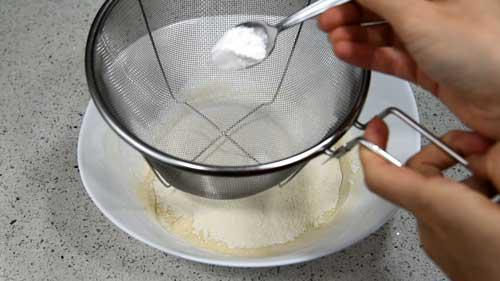 Cuando la tengamos, es el momento de agregar la levadura en polvo o los polvos de hornear, también tamizado para que no queden grumos.