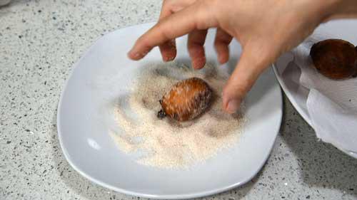 Finalmente, rebozamos los buñuelos, aún calientes, por la mezcla de azúcar y canela en polvo.