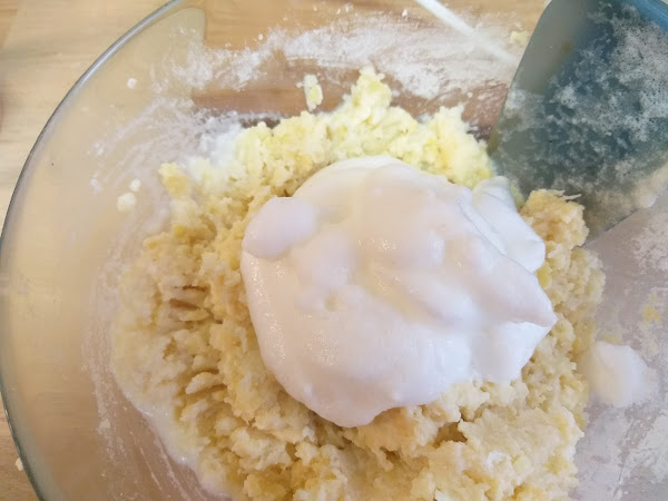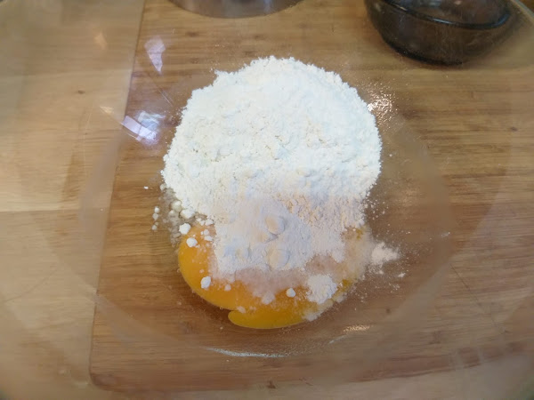 Empezamos mezclando en un cuenco la harina, la levadura y la yema de huevo. Reservamos la clara en el vaso de la batidora.