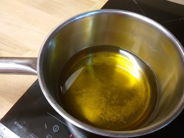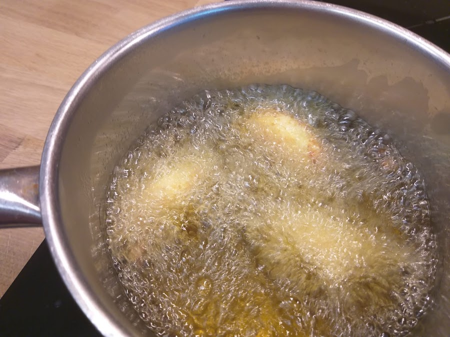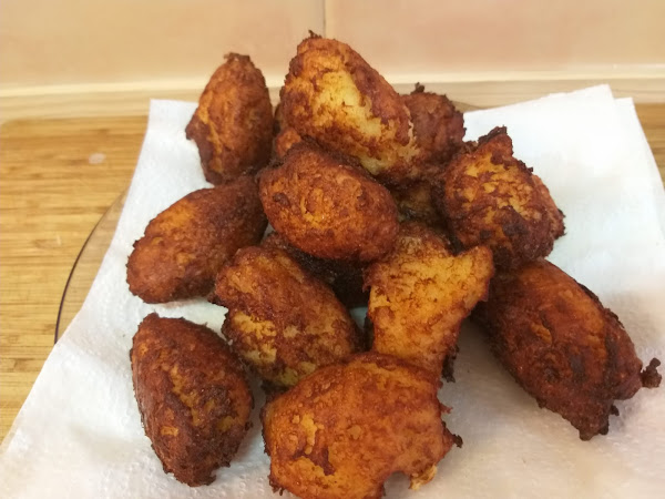 Ponemos un cazo a calentar con bastante aceite de oliva e iremos formando los buñuelos con dos cucharas (Ups, se me ha pasado hacer la foto a ese paso)