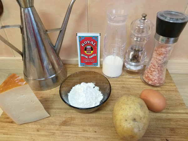 150 gr de queso Idiazabal rallado, 100 ml de leche, 1 huevo, 1 patata cocida, 50 gr de harina, 1 cucharadita de levadura, aceite de oliva, sal y pimienta negra molida.