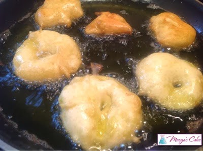 Preparamos una sartén con abundante aceite para poder sumergir y freír los buñuelos, cuando esté caliente mojamos las rodajas en la masa y vamos friendo hasta que estén doraditos y un poquito inflados y así hasta terminar todas las manzanas y masa.