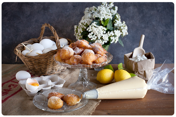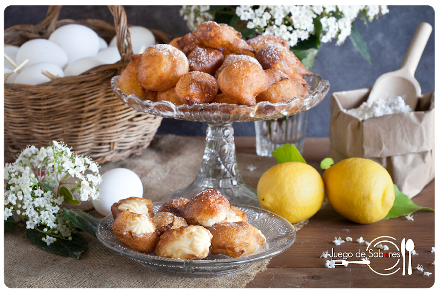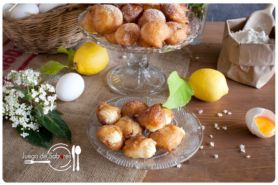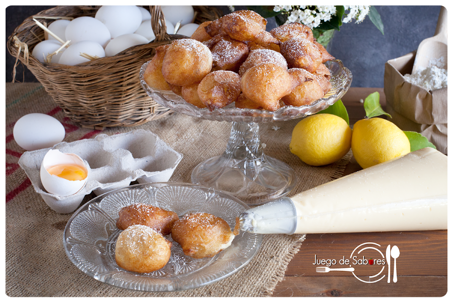 Visto lo visto, esta receta nos ha salido un buñuelo. Si nos atenemos a lo que dice la Real Academia Española, coloquialmente se llama buñuelo a “una cosa hecha mal y atropelladamente”. Palabra que los hemos hecho a conciencia y no atropelladamente, pero si una se pone a hacer buñuelos lo más normal es que te salgan con formas poco ortodoxas. Vamos, que te salgan buñuelos. Están hechos de masa de harina, mantequilla y huevo, que se fríe en abundante aceite. Son etéreos y se deshacen en la boca cuando los buñuelos son de viento, y resultan menos volátiles cuando se rellenan de crema pastelera. Son típicos de Cuaresma pero también suelen comerse por Todos los Santos, junto con las castañas y los boniatos.