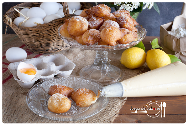 Poner en un cazo abundante aceite y cuando esté bien caliente ir echando cucharaditas de la pasta choux. Freírlos en tandas de cuatro o cinco y no echar más hasta no retirar todos los del cazo, de esta manera no alteramos la temperatura del aceite. Poner sobre papel absorbente y rellenar con crema pastelera o simplemente dejarlos sin rellenar.