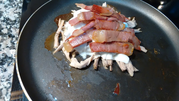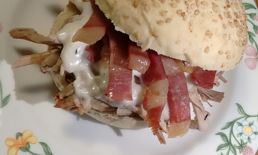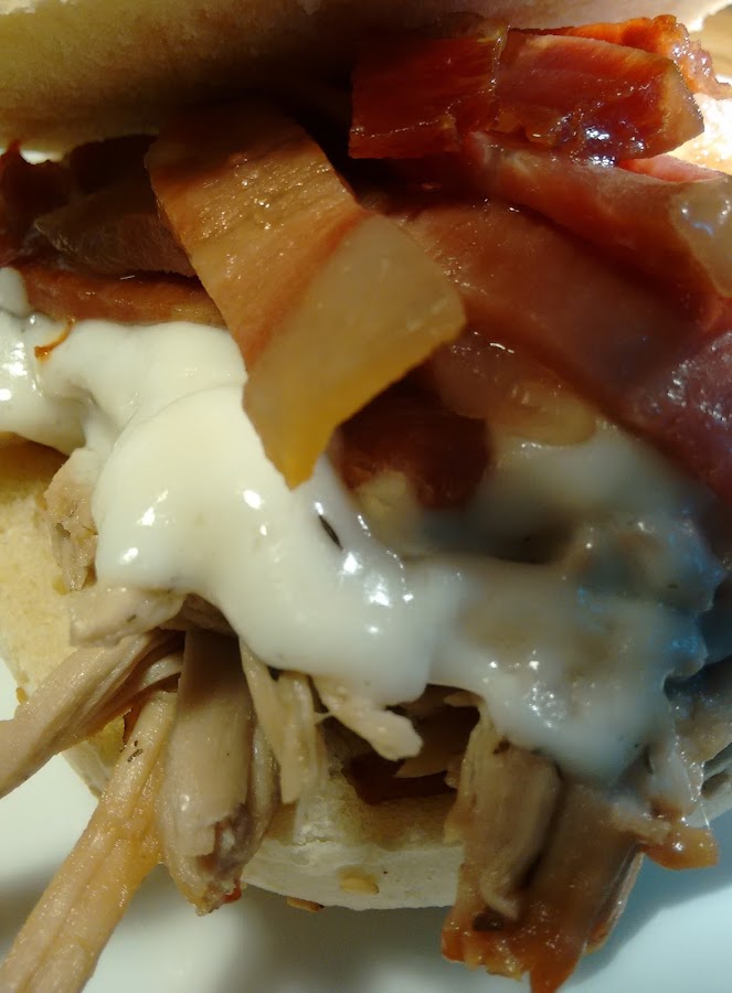 Pasamos también la carne desmenuzada y macerada en el jugo, damos unas vueltas en la plancha y ponemos el queso hasta que funda, luego ponemos encima el jamón y montamos el bocata.