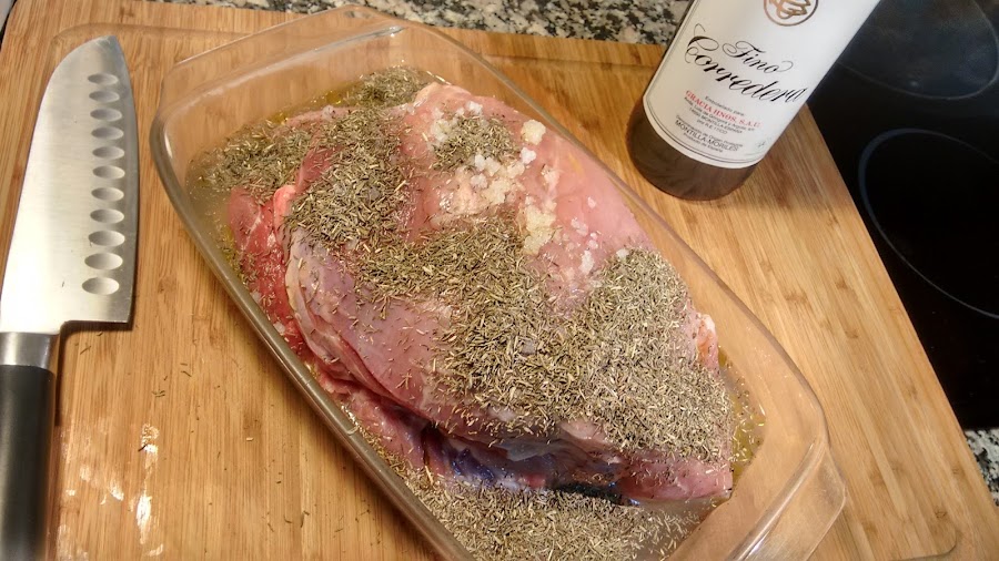 Una hora en el horno a 180º será suficiente, tiene que quedar rosita, tened en cuenta que luego hay que pasarlo por la plancha.