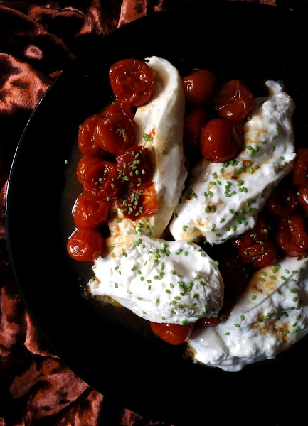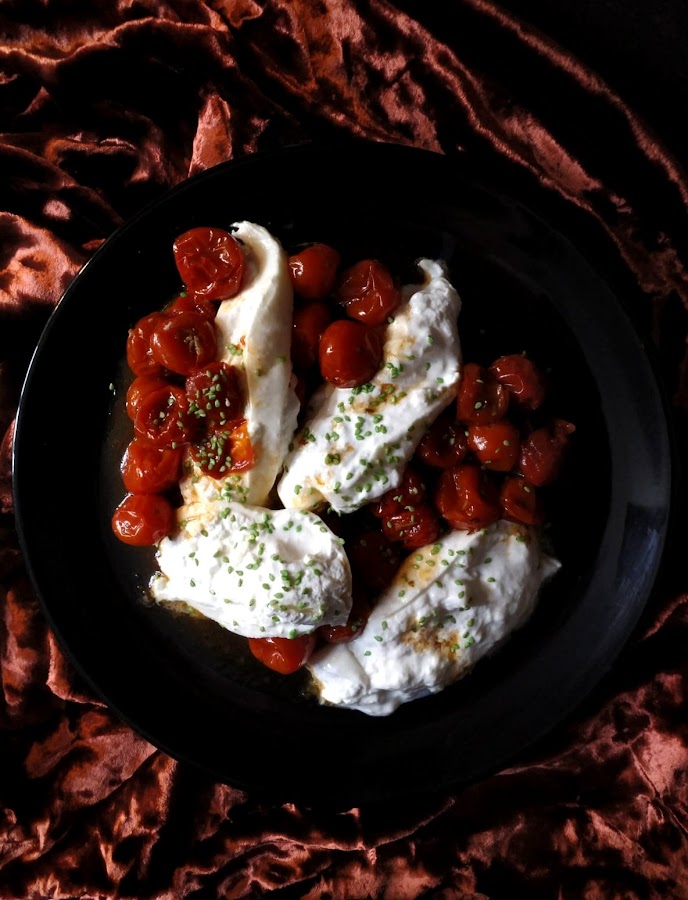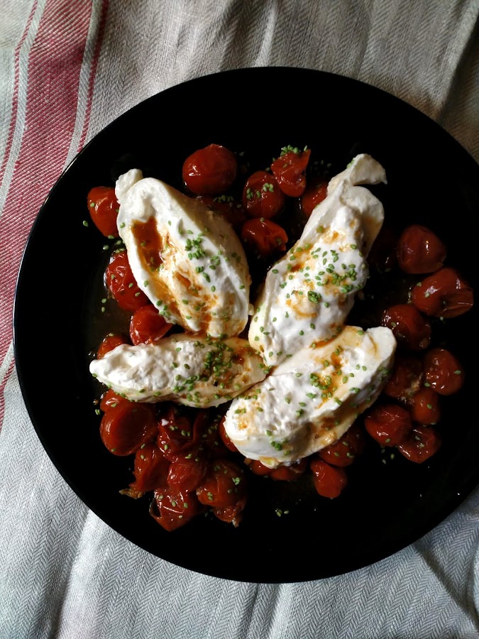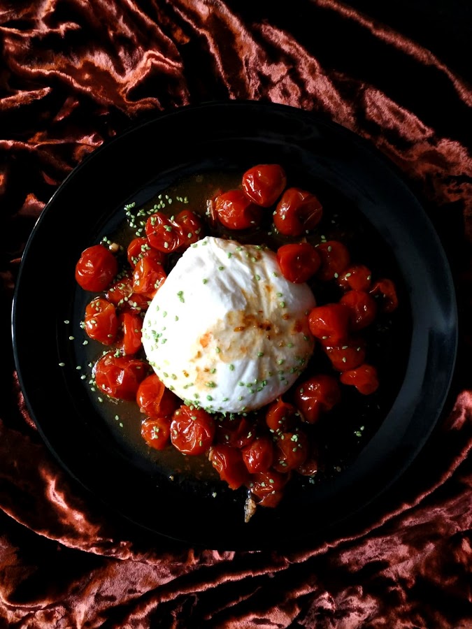 Si me seguís habitualmente sabréis que me encanta la burrata. Y me gusta combinarla con productos que no sean los típicos tomates secos con salsa pesto. Lo he visto en tantas cartas de restaurantes que me aburre ya. Yo lo he combinado con gambones, con higos y anchoas, con setas y caqui a la plancha, con boniato o incluso en un postre con fresas. Esto os lo digo para que no os de reparo el crear nuevas combinaciones. En este caso la he acompañado con tomates confitados en el horno. Si os gusta la mezcla de dulce y salado os va a gustar porque llevan azúcar que le da ese puntito.