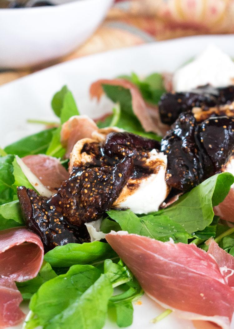 Burrata con higos confitados, prosciutto y arúgula