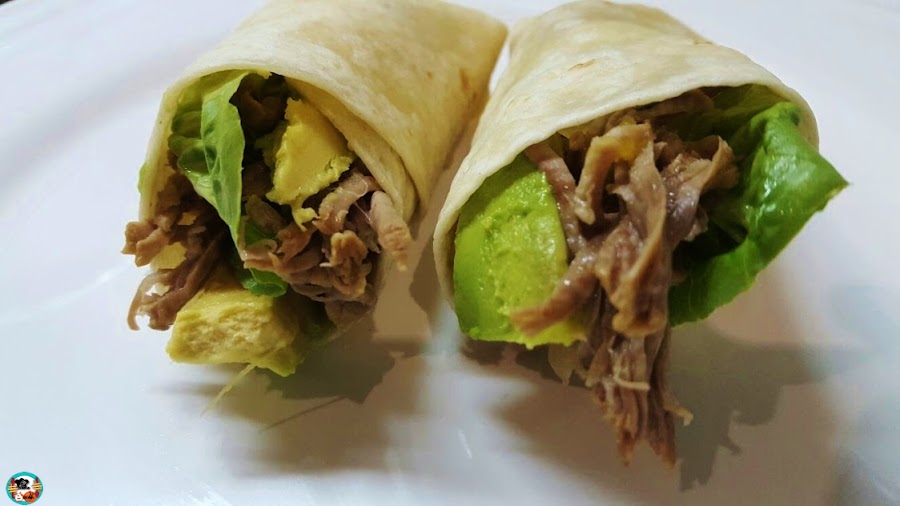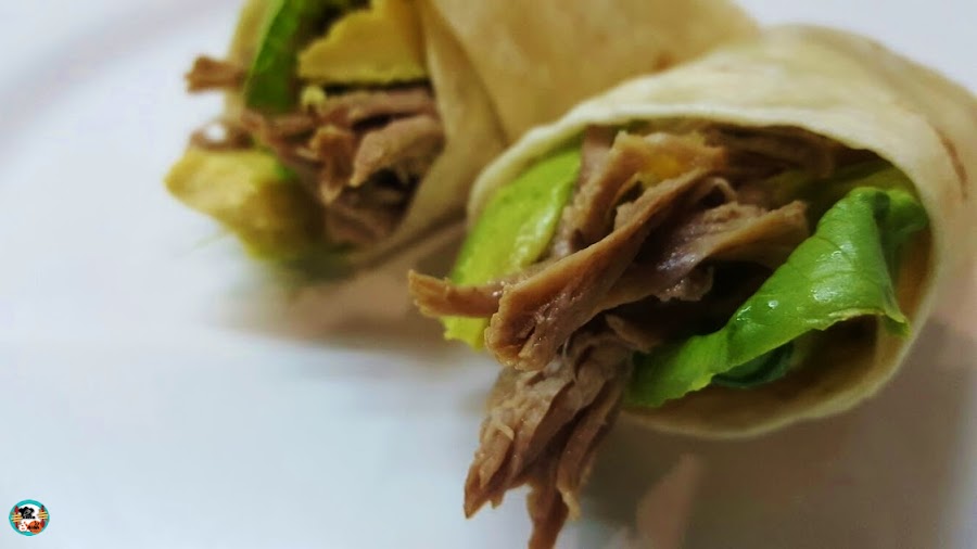 3.- Preparamos los burritos: Pelamos el aguacate lo rociamos con el zumo de medio limón y cortamos en gajos. Rellenamos las tortillas con la carne mechada, un poco de salsa de melocotones, unos gajos de aguacate y unas hojas de lechuga frescas, lavada y secada con papel de cocina. Enrollamos bien los burritos y servimos.