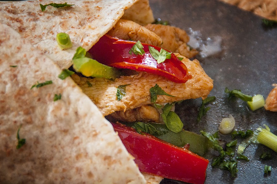 Añadimos la carne y las verduras sobre las tortillas y las doblamos para hacer unos paquetes que estén cerrados por un lado y abiertos por otro. Servimos bien caliente.