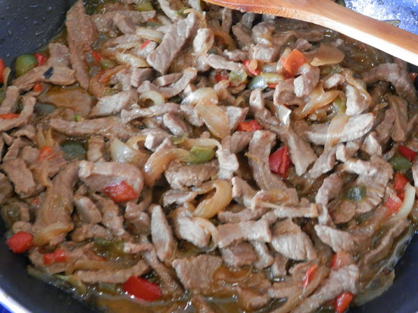 Cortamos el tiras finas los filetes de ternera y los añadimos a la mezcla de verduras.