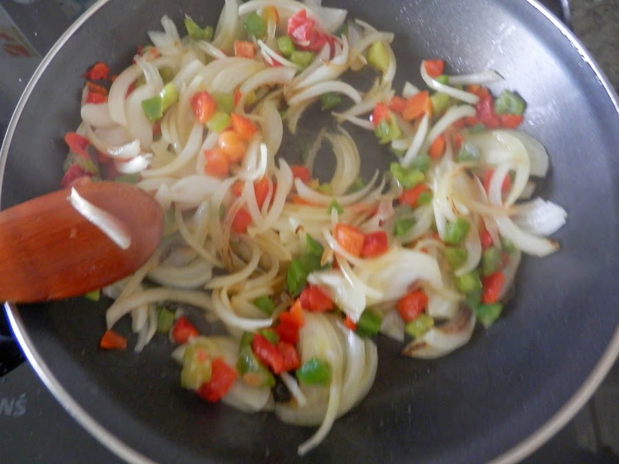 Ponemos aceite en una sartén y cuando esté caliente, añadimos la cebolla y los pimientos y empezamos a saltearlos.