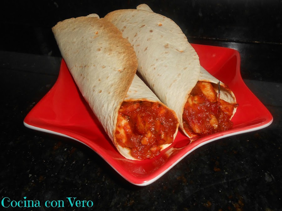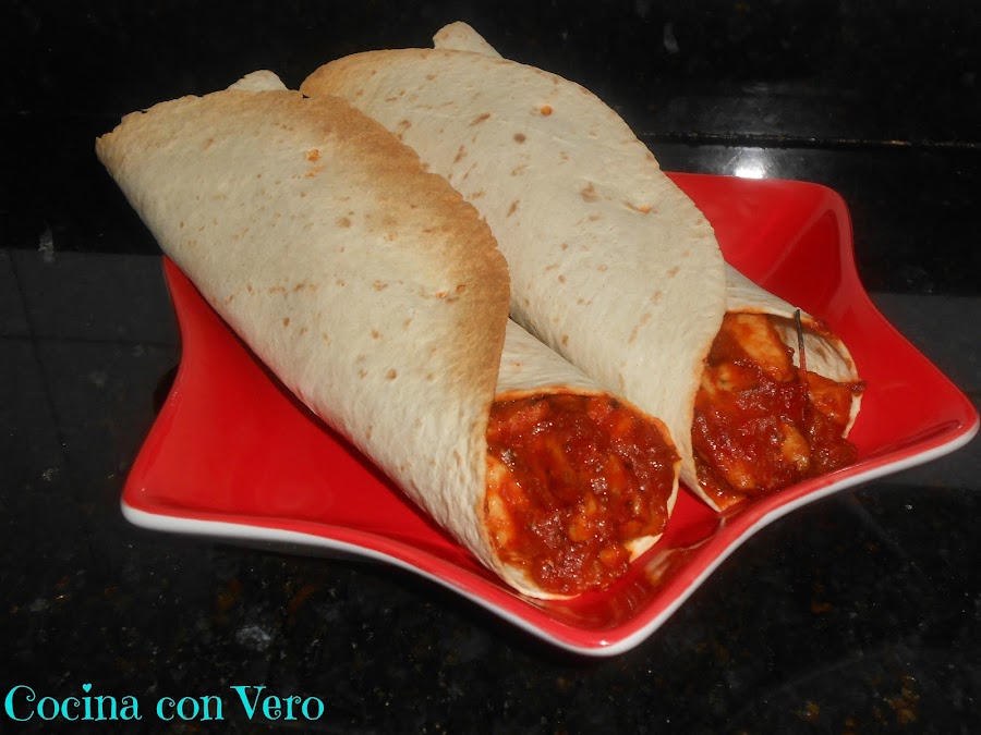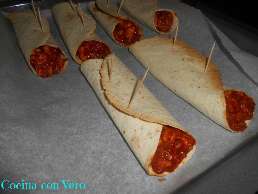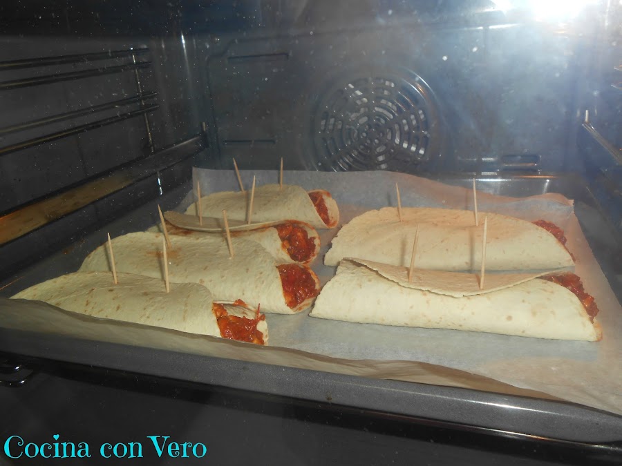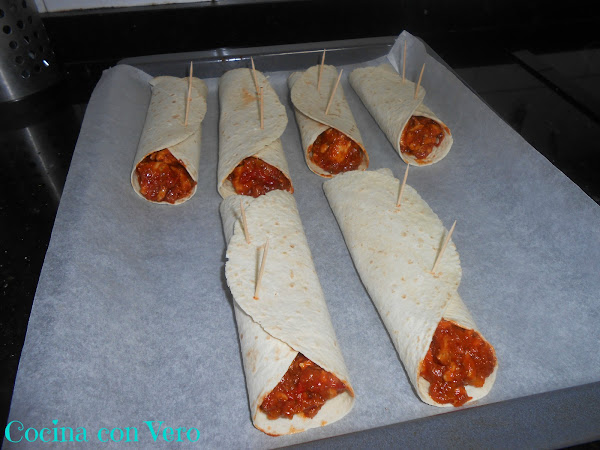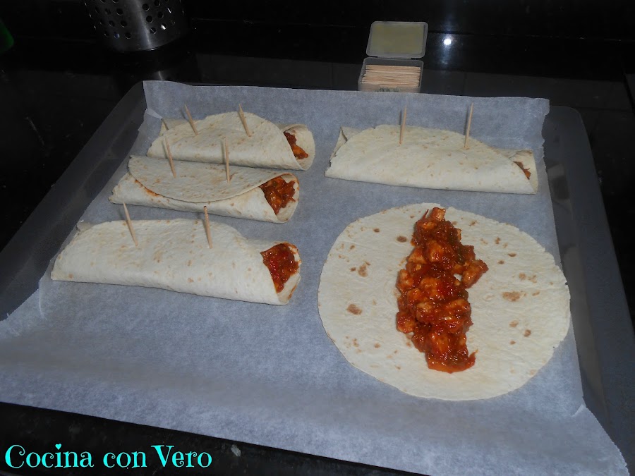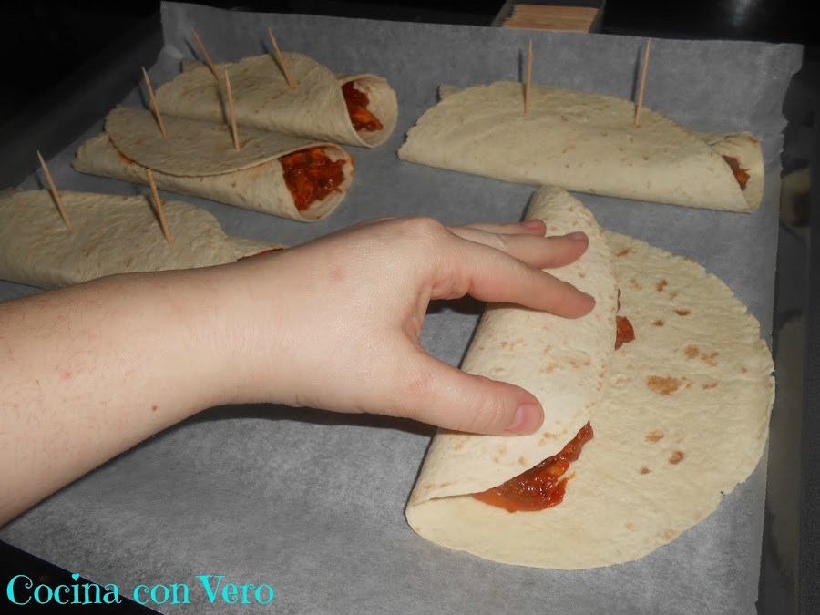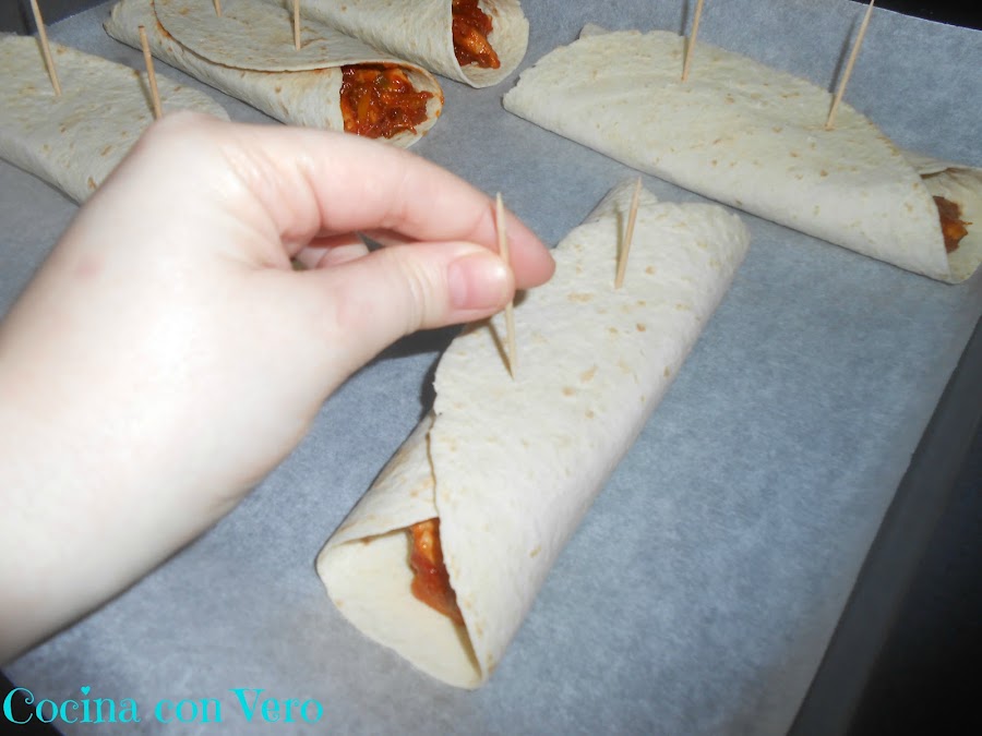 3/ Mientras procedemos a rellenar las tortillas y los cerramos con ayuda de unos palillos (2 por burrito) dejándolos en la bandeja del horno para proceder a hornearlos.