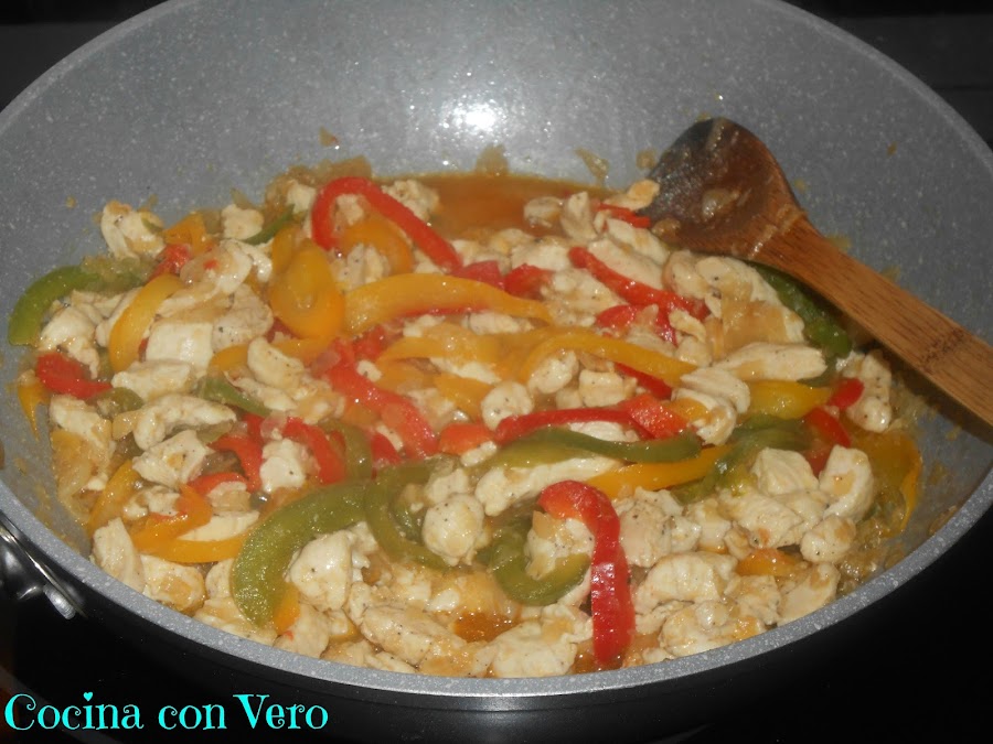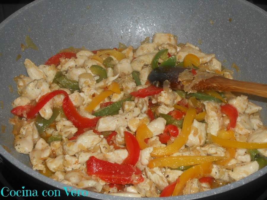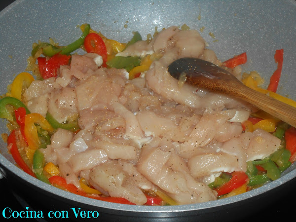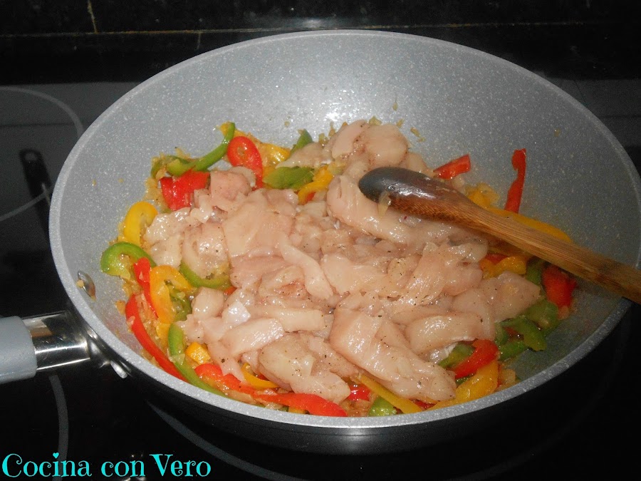 Cuando la cebolla ya esté dorada, añadimos los trocitos de pechuga de pollo, mezclamos muy bien hasta que se cocine la carne.