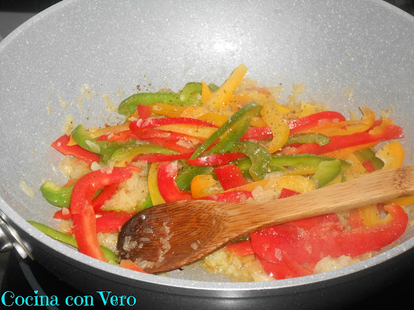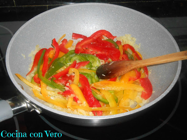 Cuando esté bien sofrita añadimos las tiras de pimientos, les damos unas vueltas para que se sofría todo junto hasta que se haga con ayuda de una cuchara de madera.