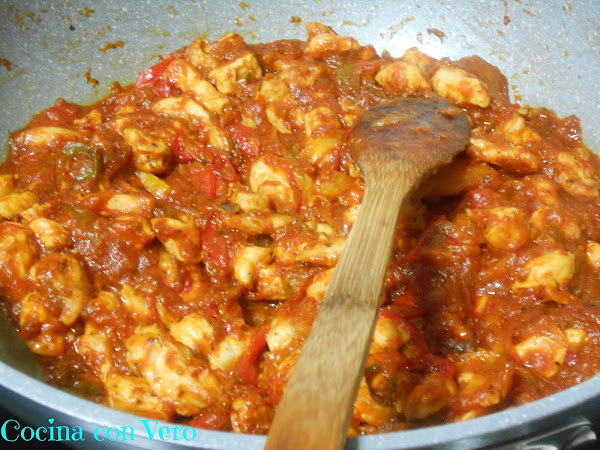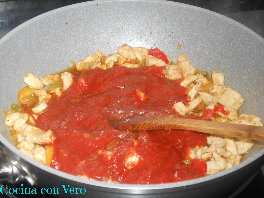 Cuando el pollo ya esté un poco doradito, añadimos la salsa de tomate sofriendola un ratito más para que coja el sabor del pollo y de las verduras. Esperamos a que se consuma un poco la salsa para que espese.