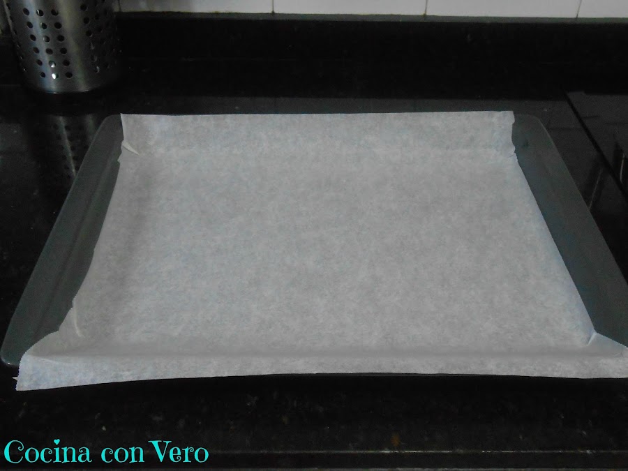 Forramos la bandeja del horno con papel vegetal y precalentamos el horno a 180ºC con calor por arriba y por abajo.