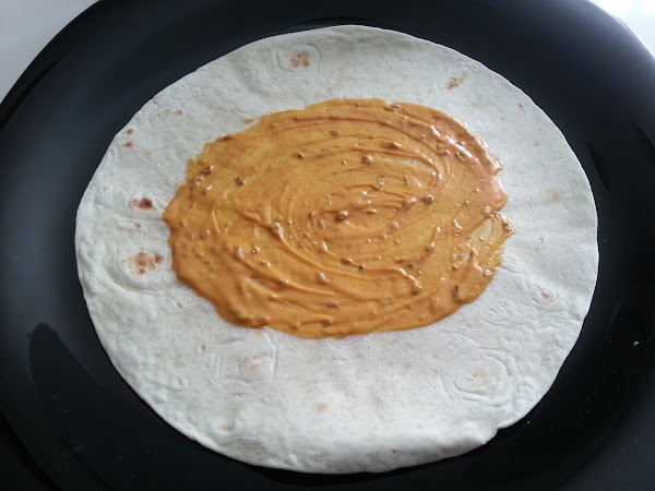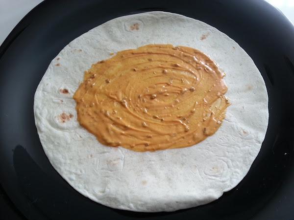 2. - Colocamos una tortita en un plato y le ponemos un poco de la salsa picante en el centro y la extendemos con una cuchara.