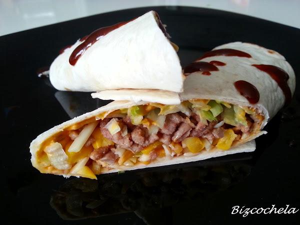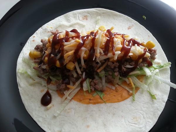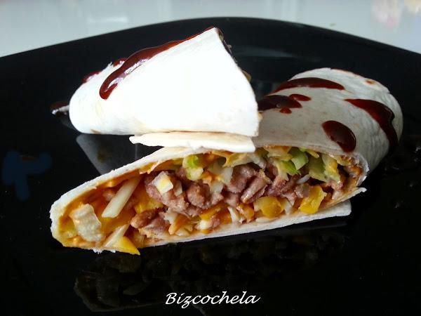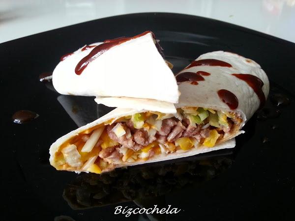 7. - Le echamos salsa barbacoa encima de todo.....y enrollamos.
