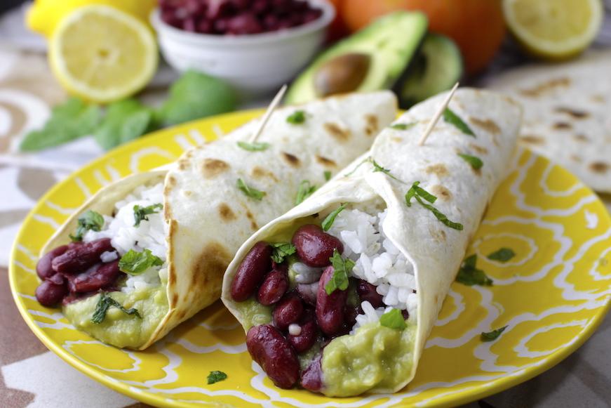 Burritos veganos con arroz, alubias rojas o frijoles, guacamole casero y menta fresca