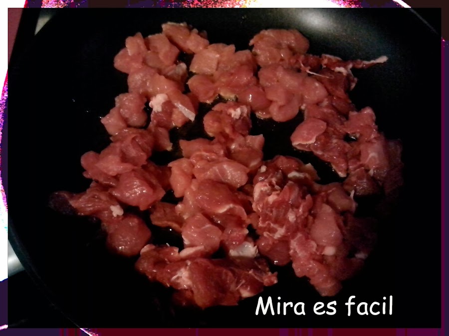 En una sartén, ponemos el aceite y sofreímos el lomo.