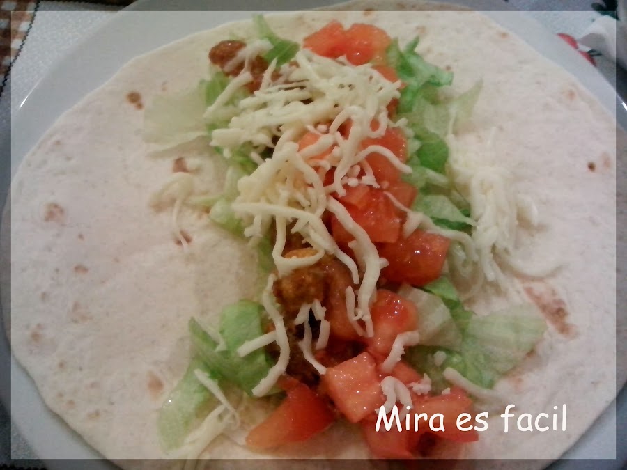 Montamos los burritos, ponemos la oblea, seguidamente la lechuga, después el tomate, la carne y el queso.