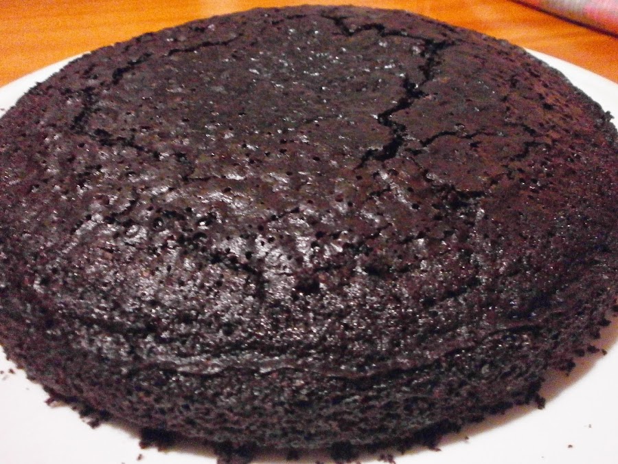 No os dejéis tentar omitir el vinagre porque es sólo gracias a su presencia que la masa sube y , os aseguro que el sabor a vinagre no se aprecia para nada . Yo no tenía vinagre blanco en la casa (y cero tiempo para salir a comprarlo ) y he usado vinagre de vino tinto ;está igualmente bien,lo único es que el color se vuelve un poco morado y lo podéis ver en la foto. Por estas dosis he usado, como recomiendan , un pequeño molde,de 20 cm, pero luego he echo una vez y media las dosis para un molde de 24 cm ( el de la foto ) .