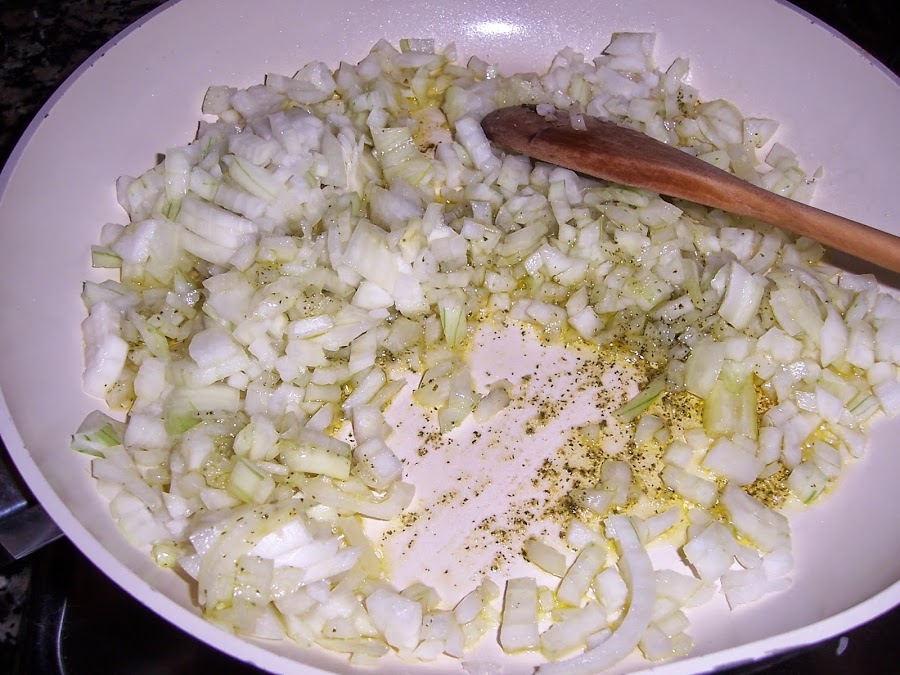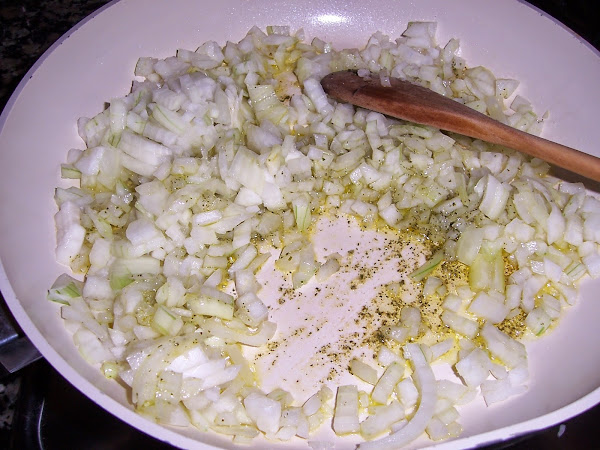 En una sartén ponemos el aceite con el ajo y el perejil y añadimos las dos cebollas bien picadas y las pochamos unos 10 minutos, si es necesario las refrescamos con un poco de agua o vino blanco.