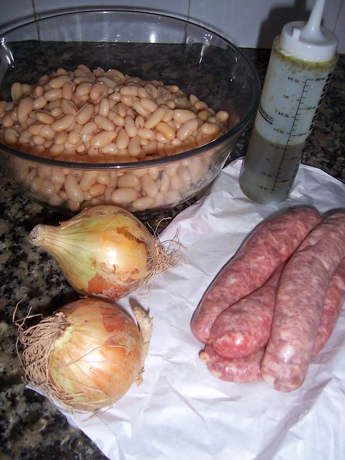 -4 butifarras (1 por persona)Ponemos las alubias a cocer con una cebolla, un pimiento, un tomate y una hoja de laurel y un puñado de sal, también se pueden poner sin nada o con puerro, apio, zanahoria, un hueso de jamón.... lo que tengas en casa.