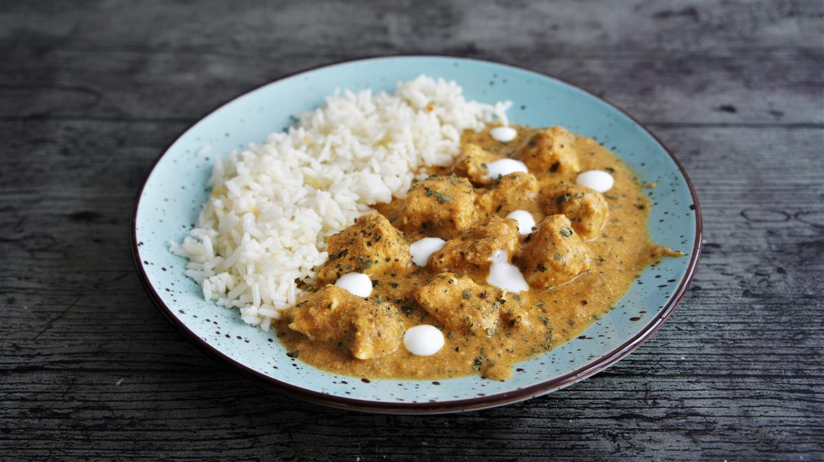Cortamos la pechuga que teníamos marinando en trozos medianos y los doramos en una sartén con un pelín más de mantequilla. A continuación, incorporamos la salsa y dejamos que cueza a fuego flojito durante 20 minutos.