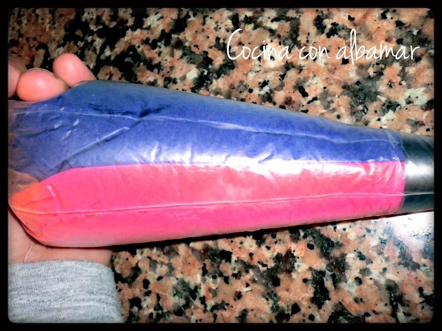 Poner la boquilla en otra manga pastelera e introducir las mangas de tal forma que todas las puntas entren dentro de la boquilla. Apretar la manga pastelera hasta que los colores salgan por igual ya que al principio puede ser que solo salga uno.