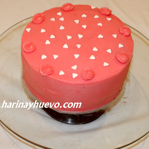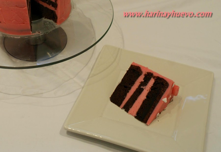 He hecho un bizcocho de chocolate, os pondré la receta otro día, y un buttercream de cereza color rosa. La combinación del color rosa con el color chocolate siempre me ha gustado y el buttercream de cereza sabe, como dice mi novio, a piruleta. Además ya mismo está aquí San Valentín y esta tarta, por su color rosa y los sprinkles de corazones , hace que sea muy romántica y así os doy una idea para ese día.